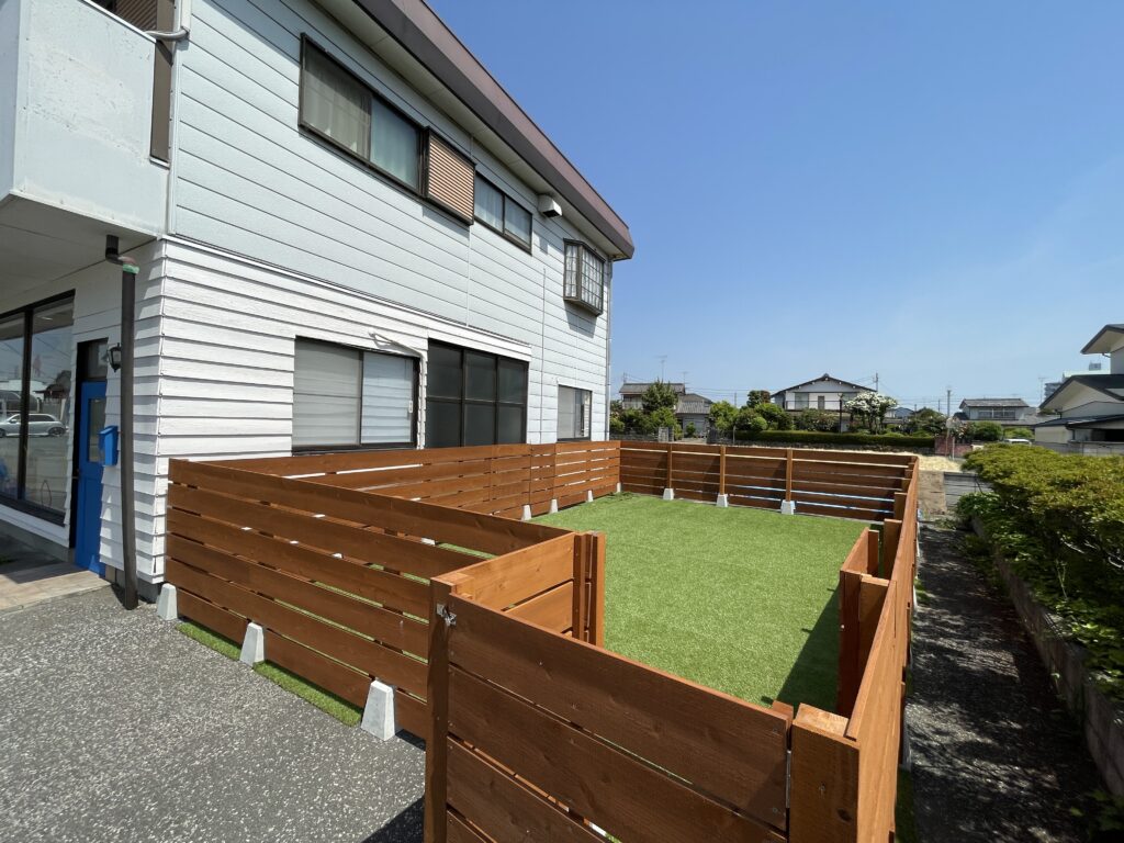 Mammy's Houseには屋内、屋外2つの ドッグランを完備している為、 保育園で毎日の遊ぶ時間やお散歩の 時間もより安全に快適に なっております。 屋内のドッグランにはワンちゃんの 足腰に優しいクッションマットを使用。 屋外のドッグランにもクッション性の ある人工芝を使用している為、 ノミダニの心配もありません。